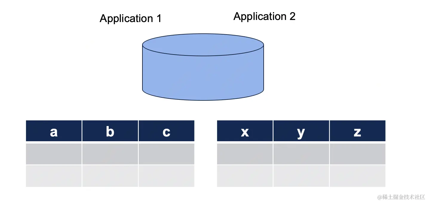 不同的系统应用,使用同一个数据库,一般具有关联属性的应用可以采用这种方式,比如一个系统分为服务端和管理端,但都属于一个系统,则可以使用同一个数据库。