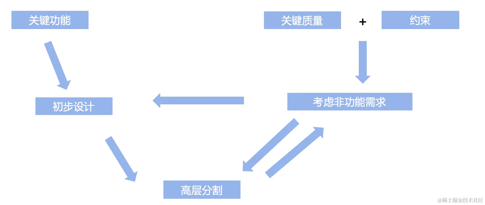 概念架构的过程是,先根据关键功能进行初步设计,然后对设计的系统进行高层分割,接下来考虑非功能性需求(关键质量和约束),然后修改自己的初步设计,循环往复,在不断的质疑和优化过程中,完善架构设计。