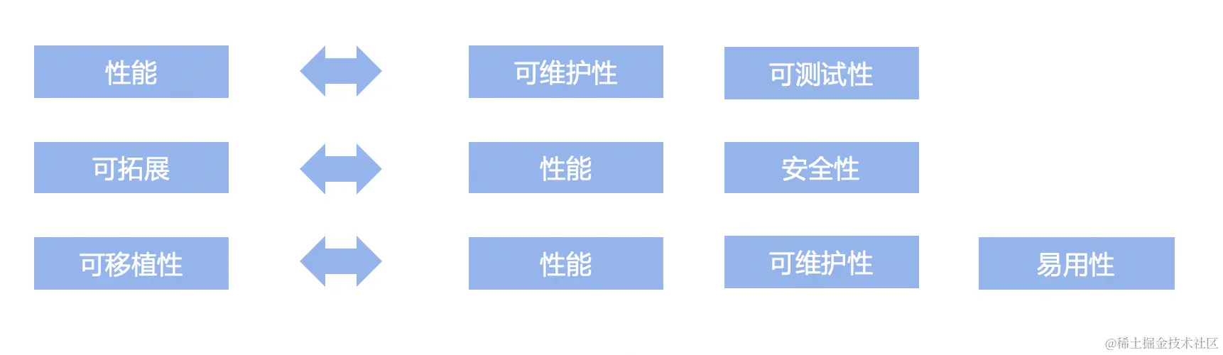 我们需要首先确定架构重点支持哪些质量属性,然后对于相互矛盾的质量属性,进行权衡折中。例如当满足性能这个质量属性时,同时就会因为引入新的方案或组件,导致可维护性,可测试性降低;提高可拓展性时,就会对系统的性能和安全性产生影响等等,我们需要做的,就是在各个关键质量中进行取舍。