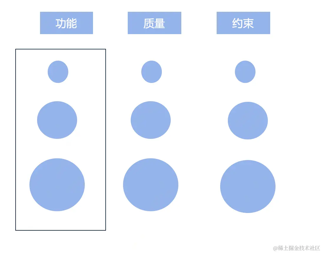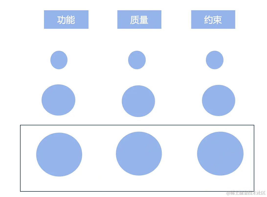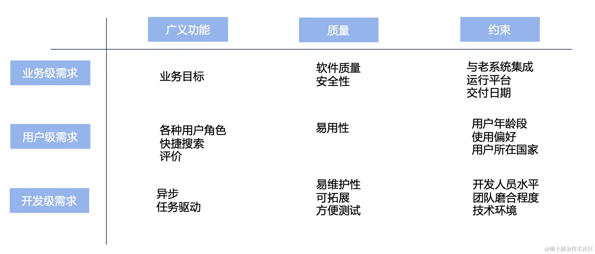 例如以下矩阵分析,将需求划分为多个维度,横向上从”广义功能“,”质量“,”约束“三个方面分析,广义功能是指需求需要满足的基本功能,及产品或业务人员的直接要求。质量维度则是系统设计时需要考虑的高并发,高可用,可拓展等技术设计维护,保证系统在满足基本需求的同时,同时对后续系统进化发展以及极端场景(例如:用户量激增,秒杀)等的满足。约束则是系统设计时的一些制约,例如上线日期,上线环境,开发人员技能水平等。纵向上划分为”业务级需求“,”用户级需求“,”开发级需求“三个维护,”业务级需求“是指产品或业务人员提出的基本要求,”用户级需求“则是从系统的使用用户角度出发,发现的例如用户电脑操作水平,用户使用习惯等潜在需求,而”开发级需求“,则是从研发人员角度出发,发现的例如可拓展,可测试,技术环境等不同维度的需求。