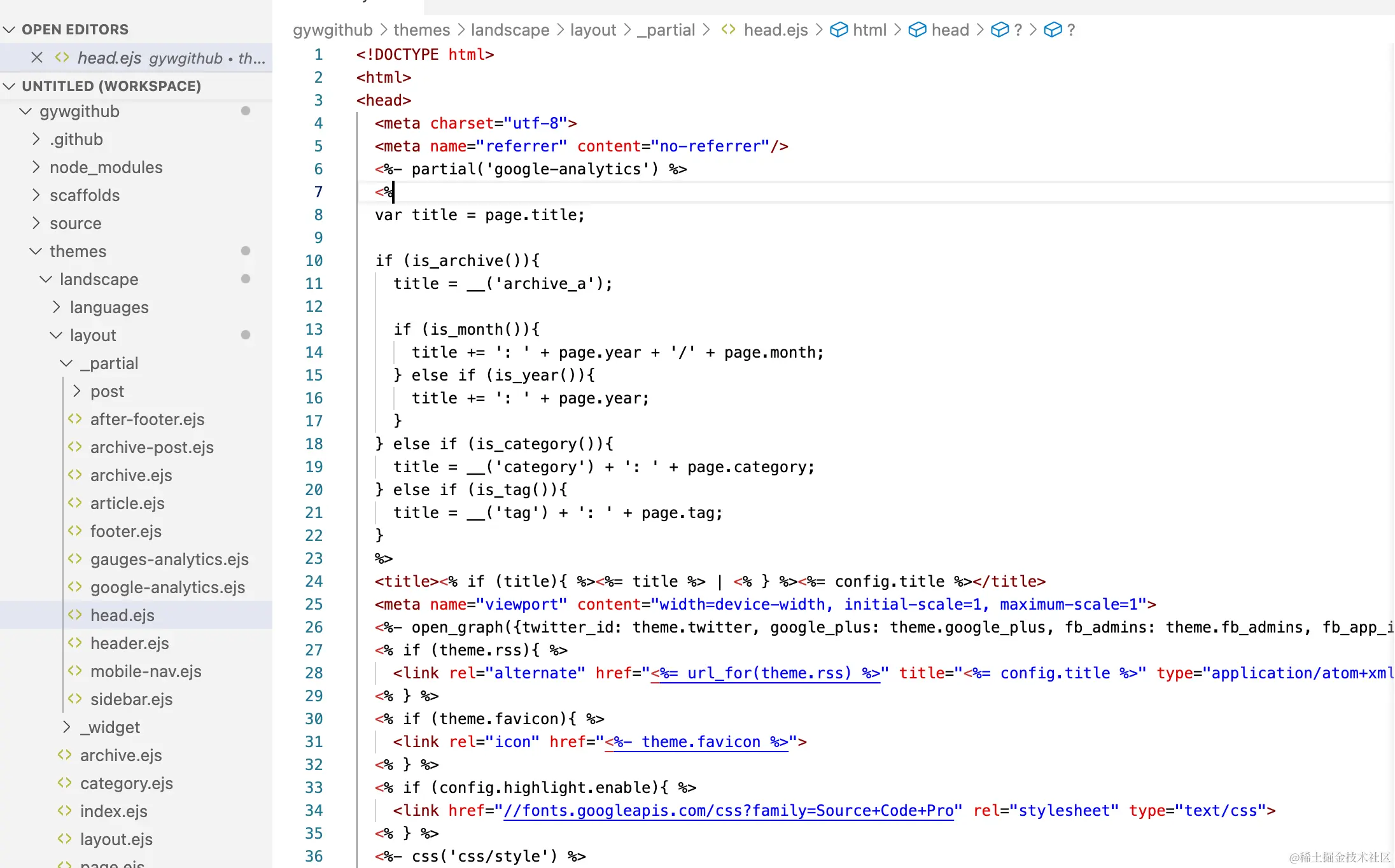 在默认 landscape 主题里,meta 标签添加在 /themes/landscape/layout/_partial/head.ejs 文件里