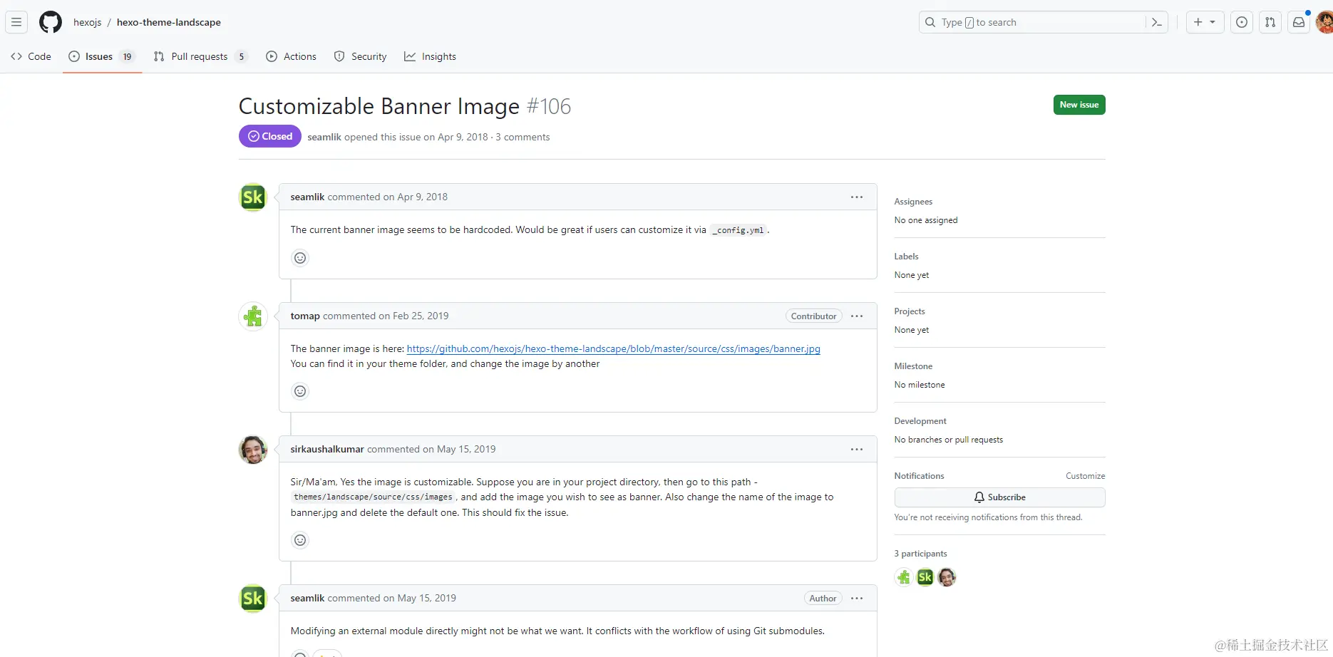 后来在 Gtihub 的 issues 区里面也看到了关于主页图片更换的其他网友的回复,也是在 themes/landscape/source/css/images 路径下修改图片文件
