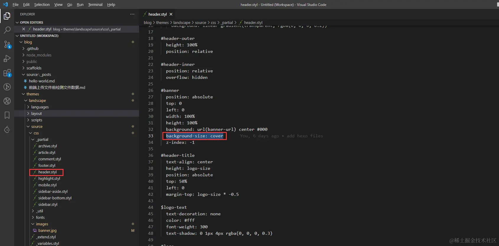 在项目的 /themes/landscape 目录下搜索 background-size: cover 找到了主页图片的样式代码,在 /themes/landscape/source/css/_partial/header.styl 文件的 #banner 中