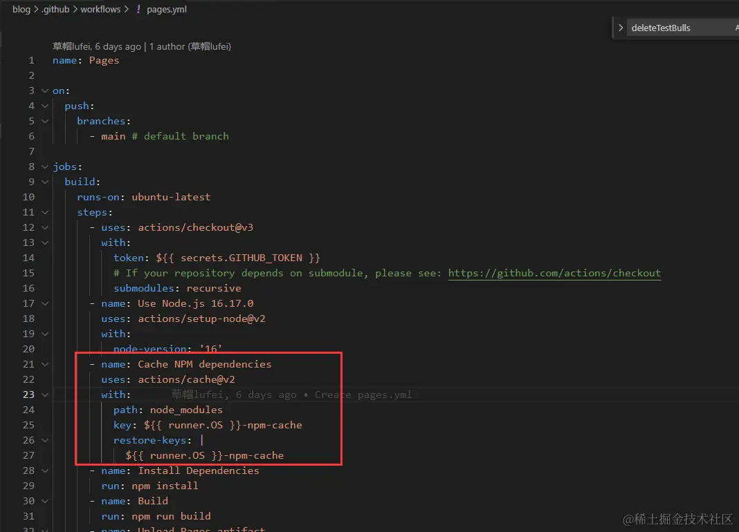 先本地测试一下,本地执行了线上的命令,一切正常,重新清理缓存后执行命令也正常,本地执行 npm run clean 和 npm run build 后提交发现还是报错,在 pages.yml 中添加 npm cache clean --force 命令还报错,最后又仔细看了报错内容和部署脚本,发现把 Cache NPM dependencies 这个命令删除了部署就好了