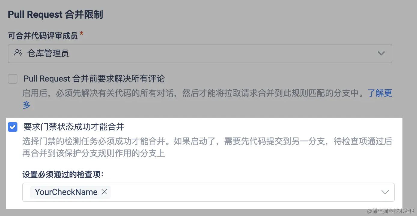在保护分支策略里,你可以设置要求门禁状态成功才能合并,这样在后续 Pull Request 创建检查时,如果检查项没有成功,该 Pull Request 是不允许合并的。