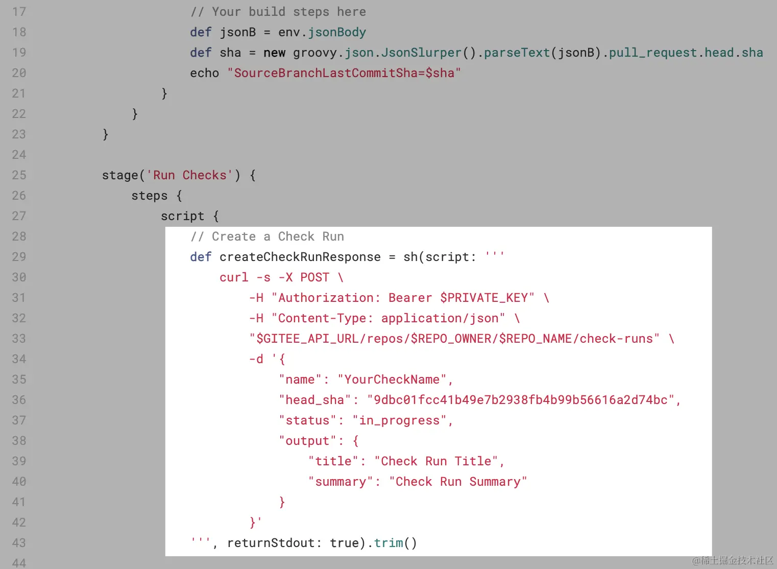 如下图高亮的这段脚本,就在流水线过程中定义了一次名为YourCheckName的门禁检查。