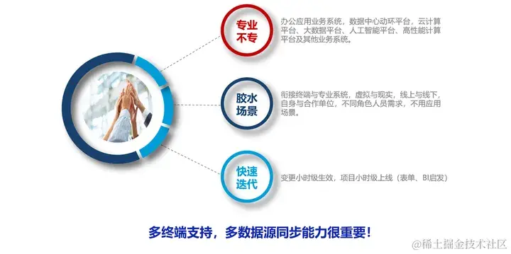我们目前有许多应用系统,衔接终端与专业系统,虚拟与现实,线上与线下,自身与合作单位,不同角色人员需求,不同应用场景,都需要将其进行整合。因此,我们正在寻找一个平台来提供这种整合能力。