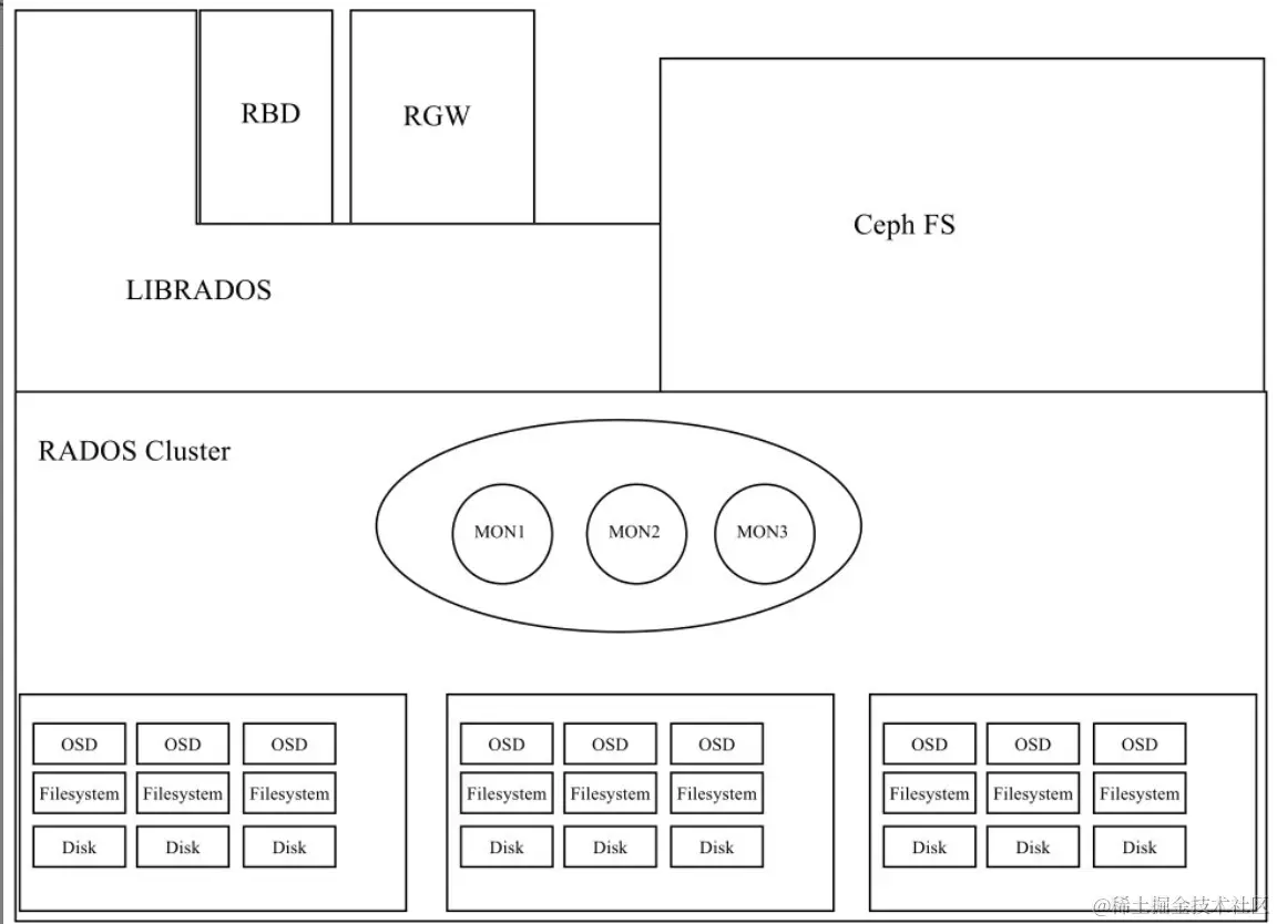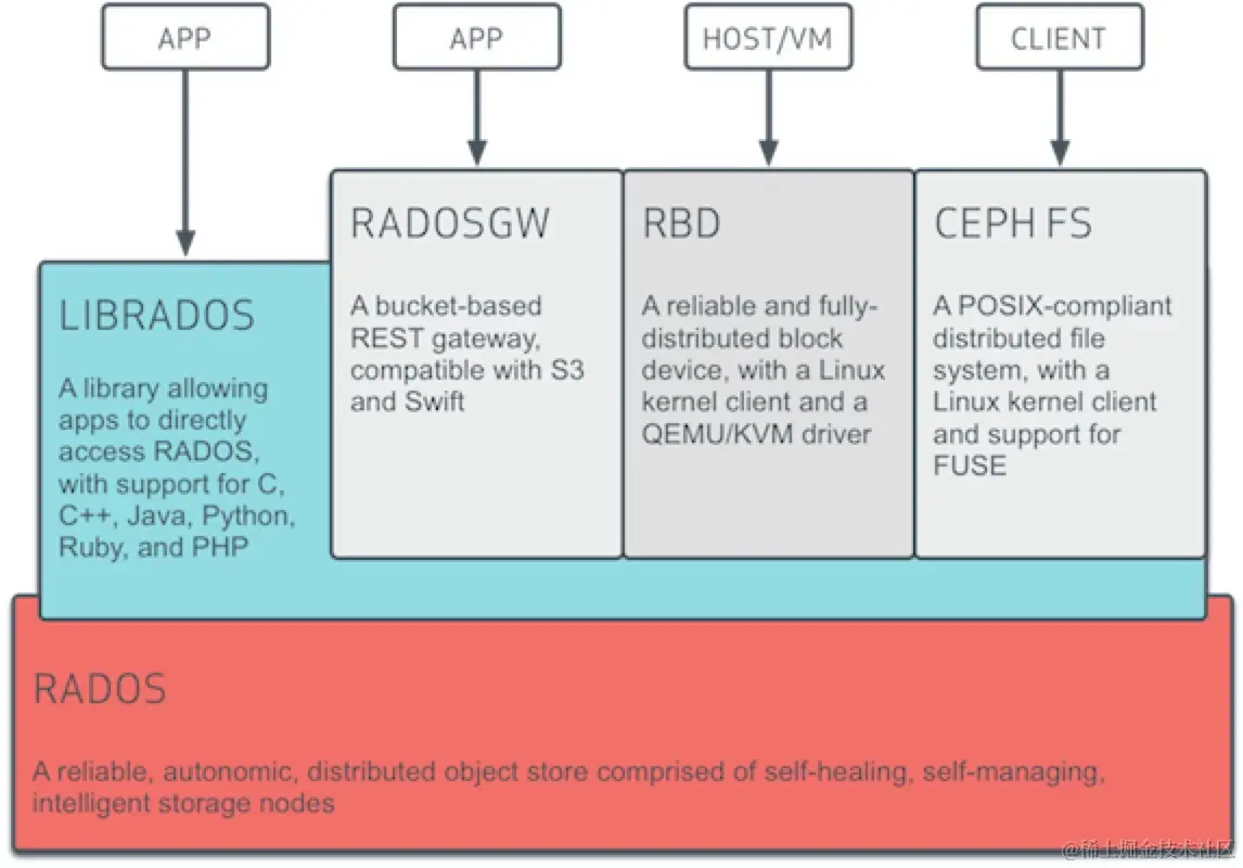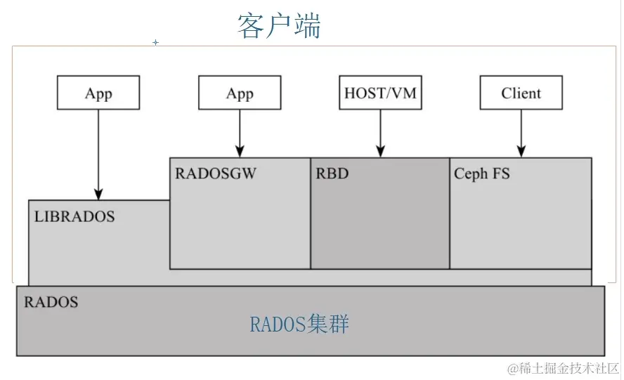 可以总结为两部分,一个集群、一个客户端。 集群就是底层的RADOS集群。客户端就是在RADOS集群之上,利用librados 编程接口的进一步抽象。其本质都是RADOS集群的客户端。
