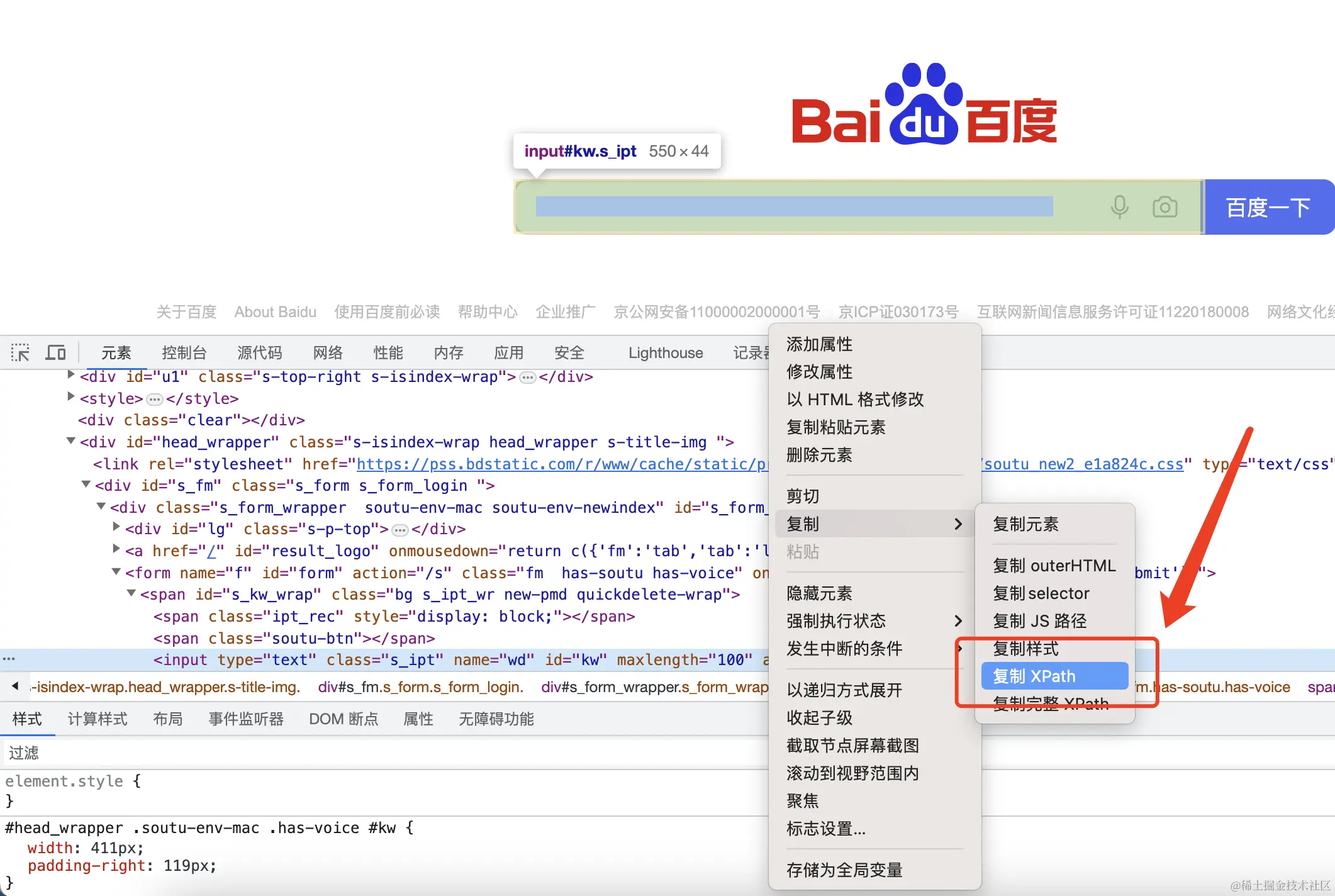 鼠标点击百度输入框即可定位到输入框元素,右键点击复制该元素的Xpath
