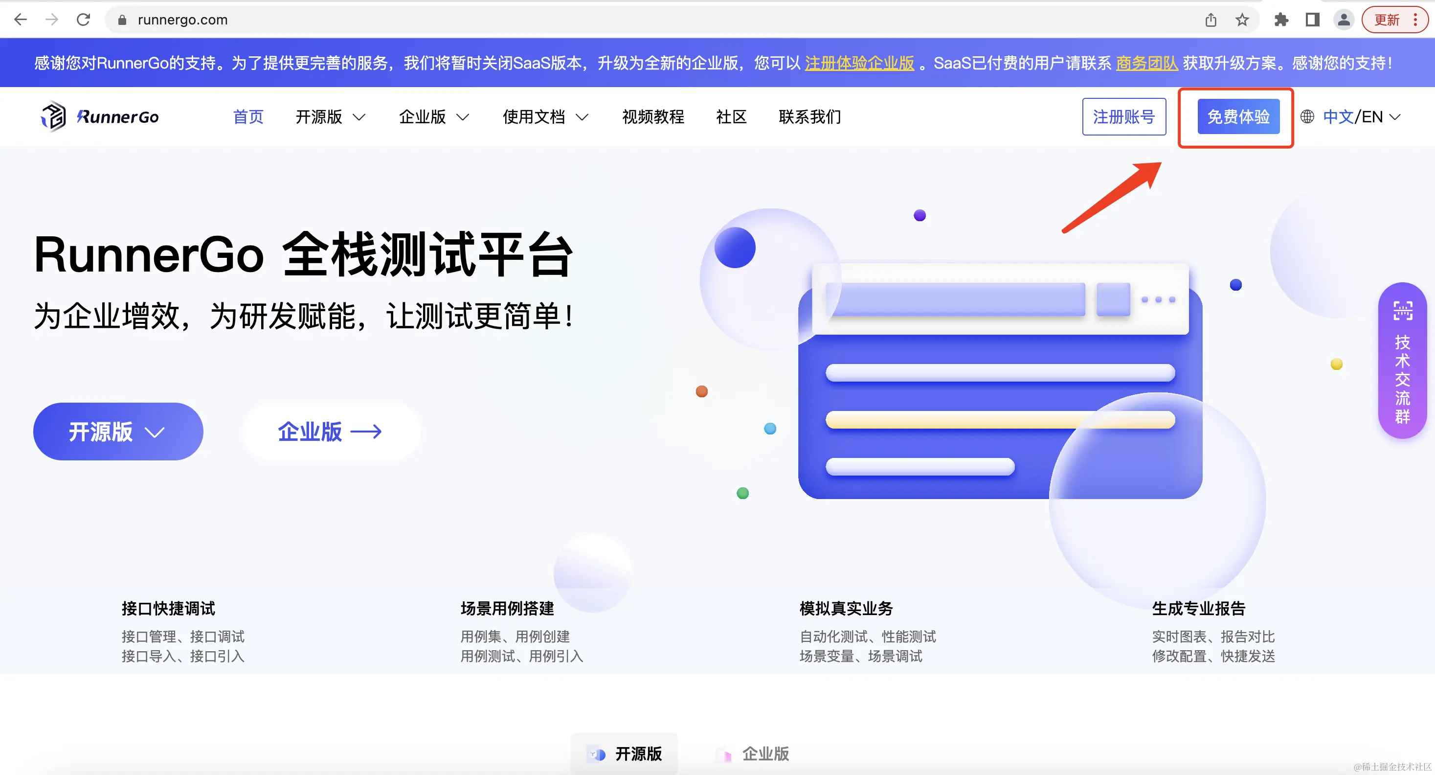 可以直接进入官网下载开源版或点击右上角体验企业版体验