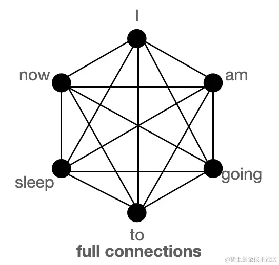 完全注意力: 模型可以直接在单个层中将信息从一个词元传输到另一个词元,因为每个词元都会对每个其他词元进行查询,并且受到其他每个词元的关注。我们考虑一个与上图类似的例子,如果模型需要将 'going' 与 'now' 关联起来,它可以简单地在单层中执行此操作,因为它们两个是有直接连接的。