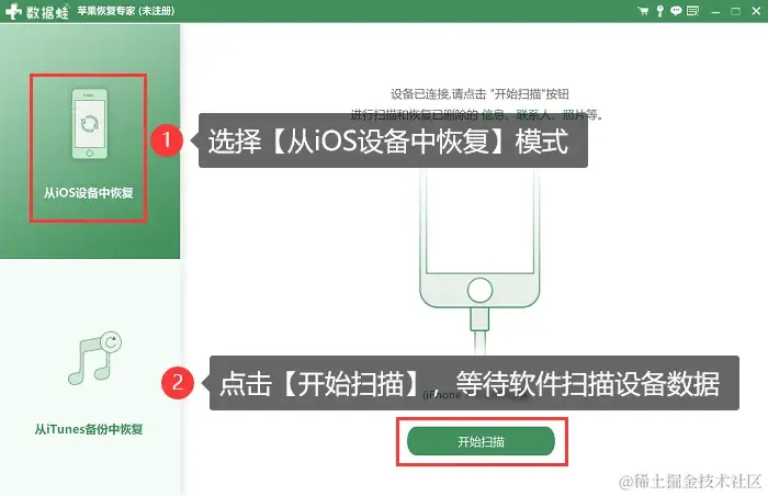 步骤2:安装完成后,打开软件。在软件界面上,选择【从iOS设备中恢复】模式,并按照提示连接您的iPhone和电脑。