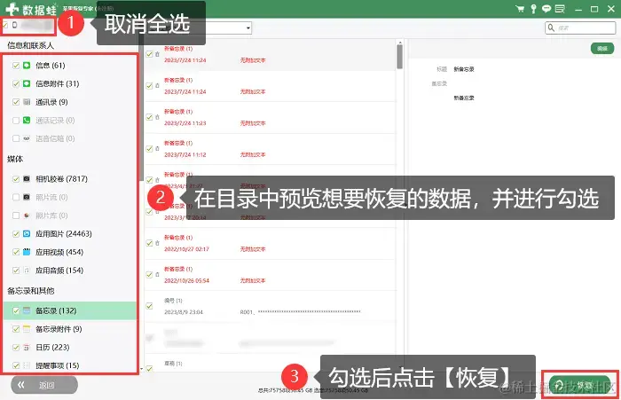 步骤4:在扫描结果中,选择需要恢复的数据类型,如备忘录、照片、短信、微信聊天记录等。