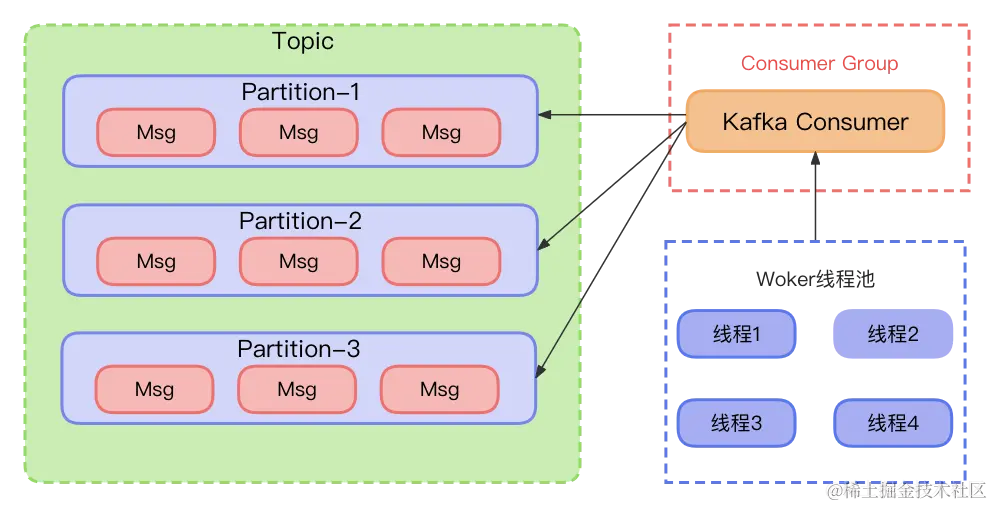 这种消费模型将 Kafka Consumer 实例与消息消费逻辑解耦,从而实现多线程消费而无需创建多个 Kafka Consumer 实例。它还具备动态调整 worker 线程的能力,使其根据消费负载情况进行灵活调整。这种模型在提高并发性能方面表现出色,却无法保证消息的顺序性。