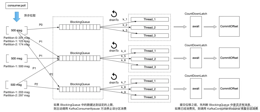 位移提交机制: 在消费前,创建一个 CountDownLatch,计数为本次消息数量。消费逻辑中,在 finally 中执行 countDown 操作,主线程阻塞等待本次消息消费完成。为了保证手动提交位移的正确性,只有当本次拉取的消息全部消费完毕后才进行位移提交。