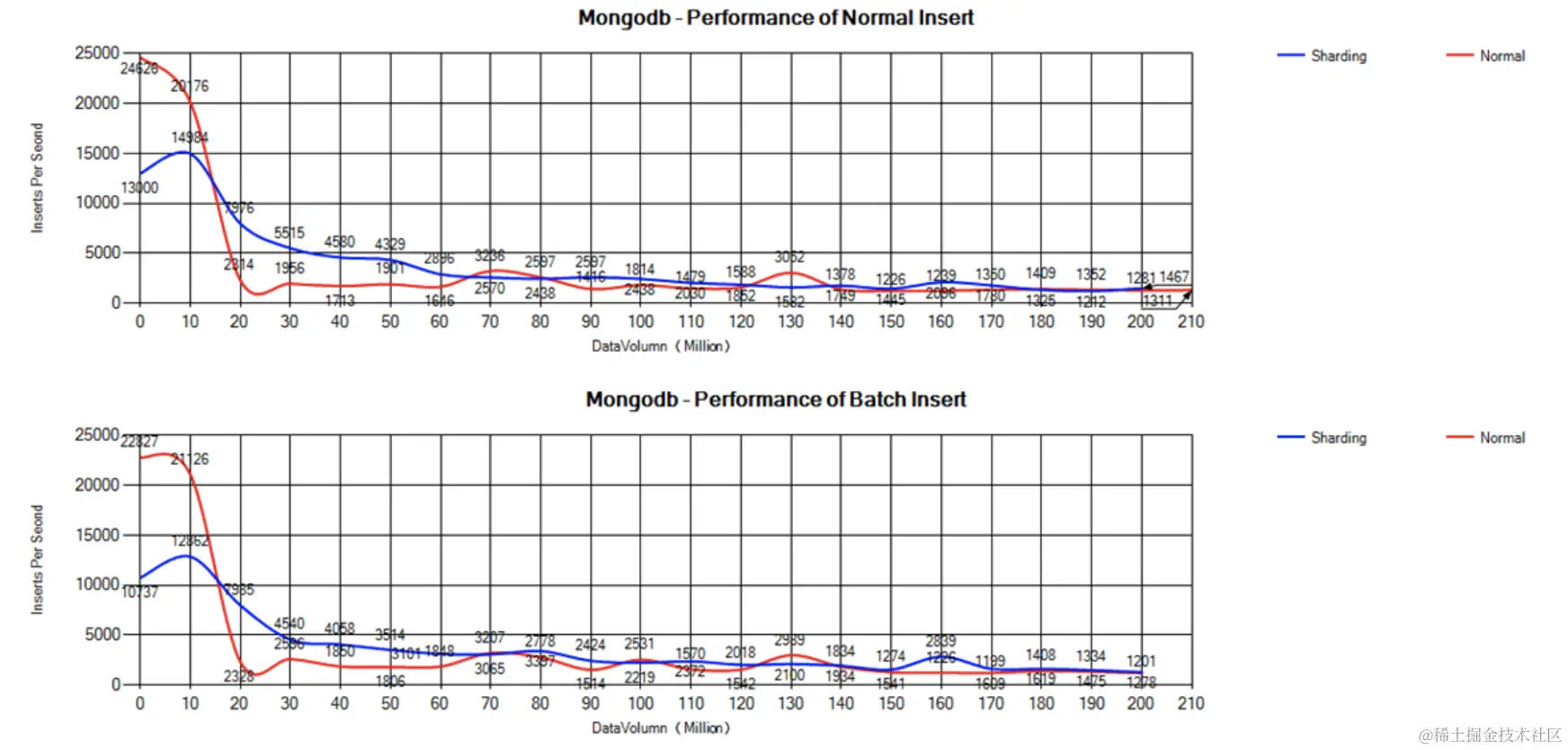 显然易见的是,当MongoDB单表数据量过大的时候,索引更新更加困难,此时,MongoDB不仅要处理数据写入磁盘的工作还需要更新巨大的索引,这无疑也会对数据插入性能造成严重影响。