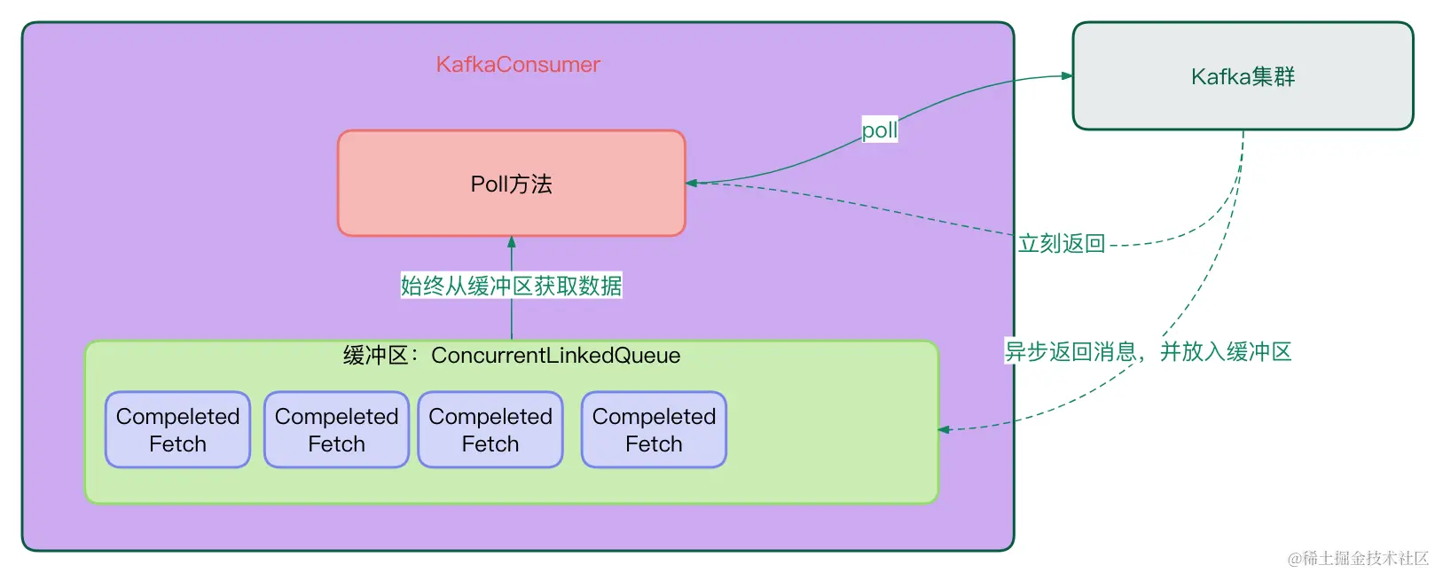 当客户端请求消息的时候Kafka Consumer会先尝试从本地缓存获取,如果获取到了消息则直接返回。
