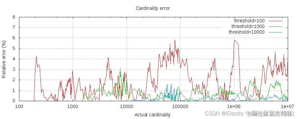 对于所有 3 个阈值,计数均准确至配置的阈值。 尽管不能保证,但情况很可能如此。 实践中的准确性取决于所讨论的数据集。 一般来说,大多数数据集都显示出一致的良好准确性。 另请注意,即使阈值低至 100,即使计算数百万个项目,误差仍然非常低(如上图所示,为 1-6%)。