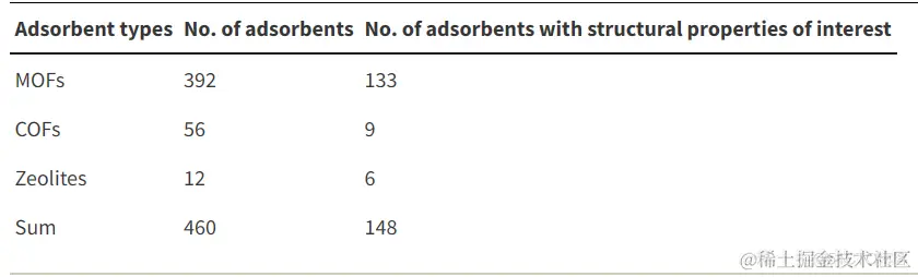 **研究者从 3.0 版的水吸附等温线数据库 EWAID 中选择了 460 种纳米多孔吸附剂,**包括金属-有机骨架 (MOFs)、共价有机骨架 (COFs) 和具有确定晶体结构的沸石 (zeolites) ,通过文献调研获取其水吸附等温线数据。