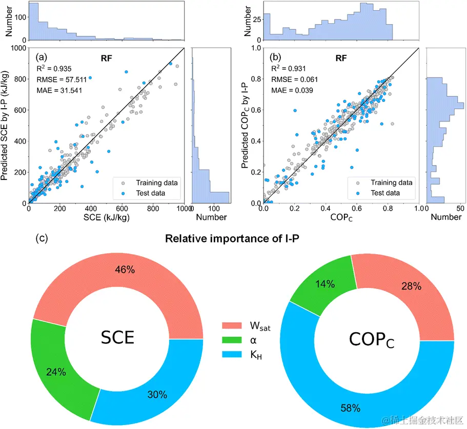 由下图 c 和 d 的相对重要性分析可见,Wsat 在确定 SCE 中占 46% 的重要性,KH 在确定 COPC 中占 58% 的重要性,这意味着 Wsat 和 SCE、KH 和 COPC 之间存在很强的相关性。