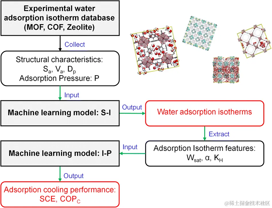 华中科技大学的李松课题组,建立了一个两步机器学习模型,训练 AI 通过材料的结构参数预测水吸附等温线参数和后续应用性能。