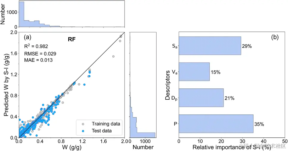 由下图 b 的相对重要性分析可见,吸附压力 (P) 对吸水量影响最大,二者成正相关。在固定压力下,吸附剂的结构特征,特别是表面积和孔隙体积决定吸水量多少。