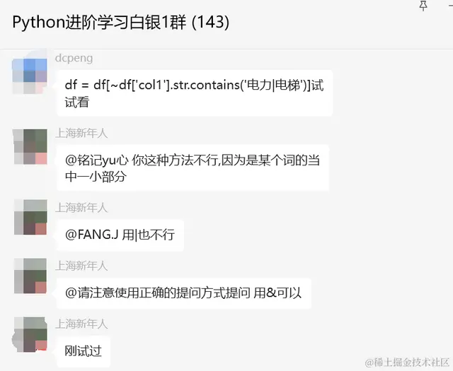 这里【莫生气】和【FANG.J】继续给出了答案,可以看看上面的这个写法,中间加个&符号即可。代码如下:df = df[~df['col1'].str.contains('电力|电梯')]。