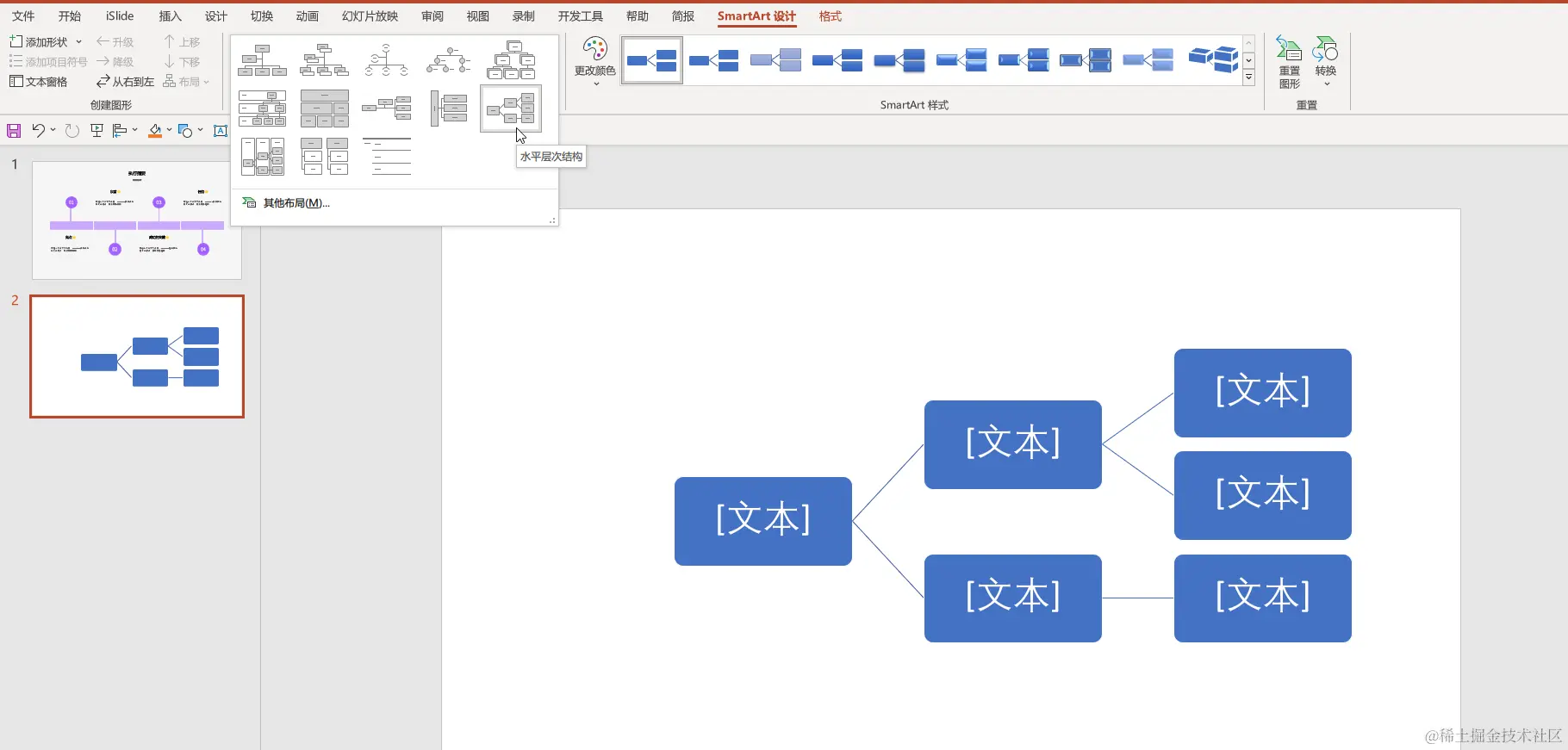 首先,在 PPT 中打开 SmartArt 功能,然后选择一个适合你需要的信息结构的图形,例如 “层次结构”。然后,你只需要在 SmartArt 的文字框中填入你的信息,就可以看到你的信息以图形的方式展示出来了。