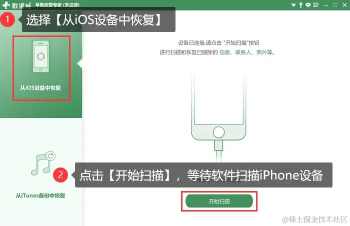 步骤2:通过数据线将您的iPhone设备连接到电脑上,选择【从iOS设备中恢复】,并点击【开始扫描】,然后等待软件识别iPhone。