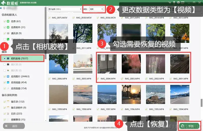 步骤4:在软件页面上点击【相机胶卷】,然后选择需要恢复的视频,最后点击【恢复】并选择一个位置保存恢复的视频即可。