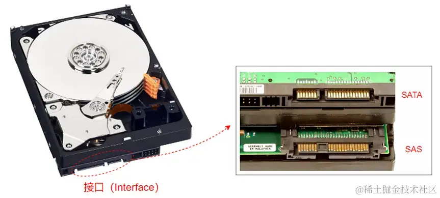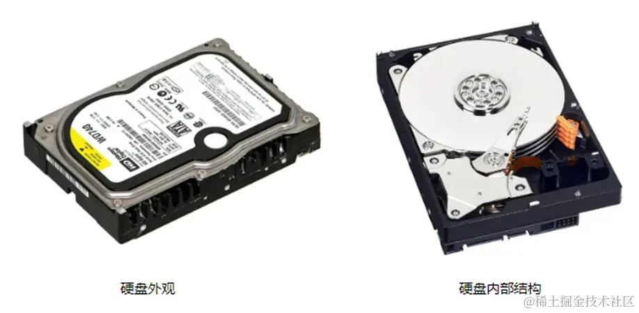下面这个图是3.5寸机械硬盘的真容,想必大家都见过,其中左侧是外观,右侧是内部的结构。这个也是目前应用最多的硬盘类型。无论是在消费级市场,还是企业级市场都是这样。差异可能是消费级使用的大多是SATA接口的硬盘,而在企业级使用大多是SAS接口的硬盘。