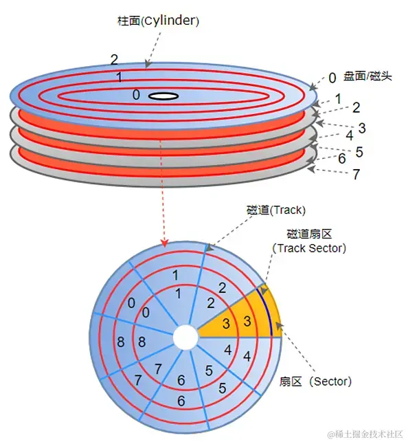 前面在实物图中我们已经看到磁盘是由很多个盘片组成的,数据正是存储在这些盘片上的。盘片在逻辑上被划分为一圈一圈的,数据是存储在这些圈圈上的。如下图所示盘片上的红色圈圈被称为磁道(track),从圆心向外画两条直线,可以形成一个扇面,称为扇区(Sector)。同时在每个磁道上会形成一个弧段,称为磁道扇区(图中蓝色部分)。磁道扇区是磁盘的最小组成单元,通常是512字节。
