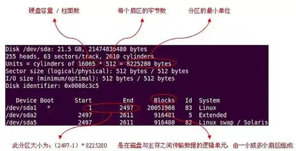 那么如何查询磁盘的参数信息呢?以Linux操作系统为例,可以通过fdisk -l命令查看磁盘的详细信息。如图所示,显示的磁盘的详细信息。