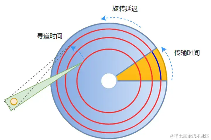 磁盘传输数据的大概流程是这样的。当上层下发读写请求时,磁盘的驱动器将请求转换为具体的磁道编号和扇区编号。然后定位到具体的位置进行数据的读写。这个定位过程可以分解为2步,也就是摆动磁臂到具体磁道的过程(寻道)和等待盘片旋转到指定扇区的过程。这两个过程也涉及两个不同的时间,也即寻道时间(Seek time)和旋转延迟(Rotational delay)。下面我们具体解释一下这两个时间。