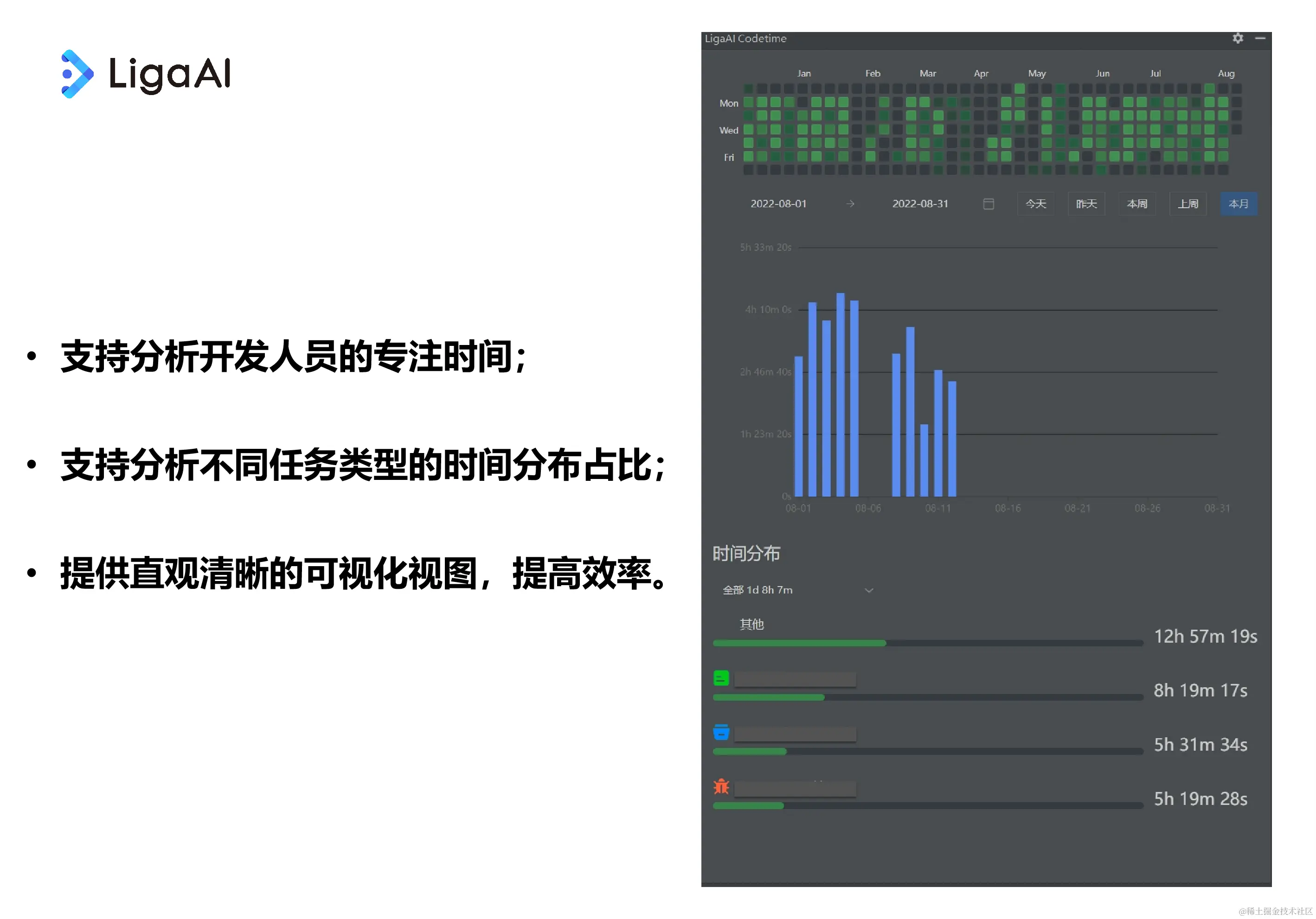 因此,利用 LigaAI IDE 插件提供的可视化图表,研发团队还可以了解整体编码情况、不同任务类型的耗时分布等,更有针对性地制定优化方案,或调整规划排期。