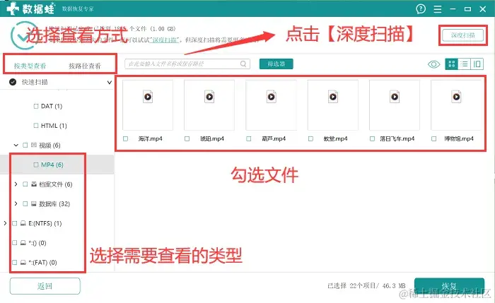 3.用户可以根据个人习惯,选择 【按类型】或是【按路径】 对扫描结果进行查看,如果找到需要恢复的文件,可以直接将其勾选,否则,点击 【深度扫描】 进行等待;