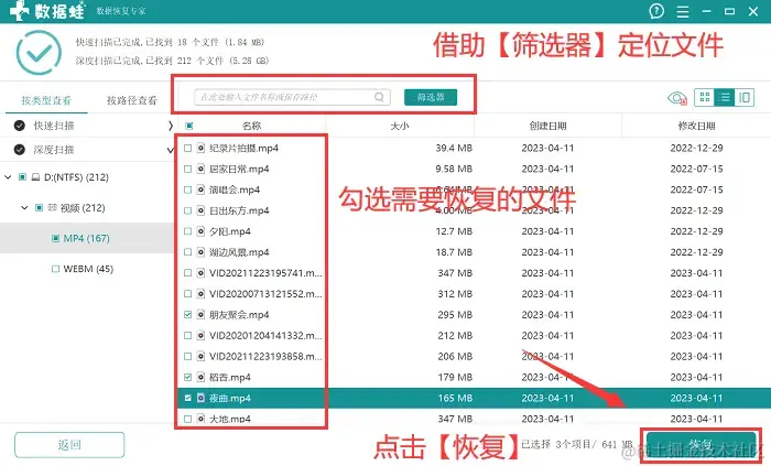 4.深度扫描之后,用户可以根据恢复需求再一次对需要恢复的文件进行选择,如果文件太多,可以利用 【筛选器】 对文件进行定位,完成选择后,点击【恢复】。
