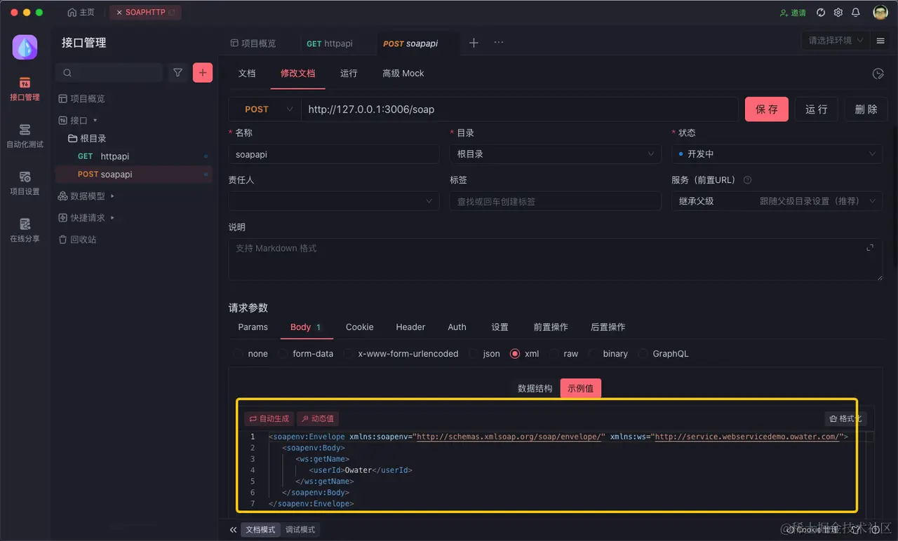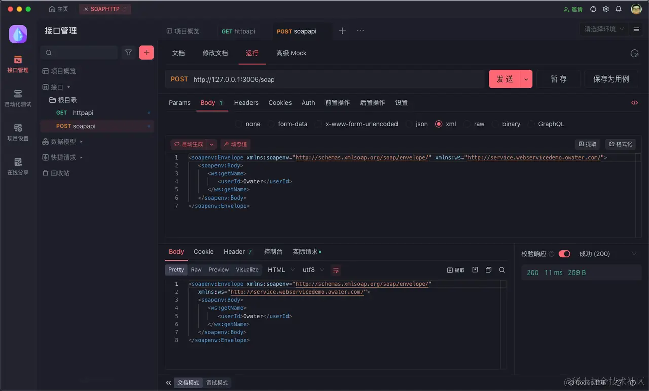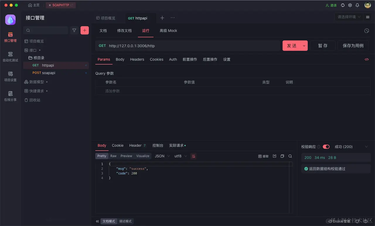 无论是 SOAP 还是 HTTP ,最终都得写成一个个的接口给前端去调用,所以接口,也就是 API 的调试是非常重要的,对一 SOAP、HTTP 这些协议的 API 调试,可以使用 Apifox 进行调试,Apifox 可以无差别调试这两种 API。