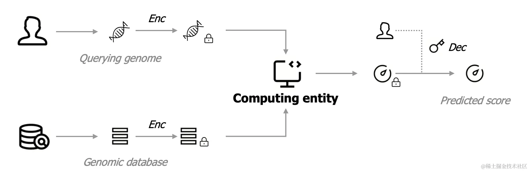 同态加密赛题设定的场景是:法医鉴定时,检查机构使用嫌犯基因、向数据机构的基因数据库去查询是否存在嫌疑人的亲属,从而快速定位嫌疑人身份。赛题要求检查机构和数据机构的基因数据都需要使用同态加密技术保护,数据经过加密后会交由一个第三方计算机构进行密文预测,最后得到的密文结果可以被检查机构解密作为判断亲属关系的依据。