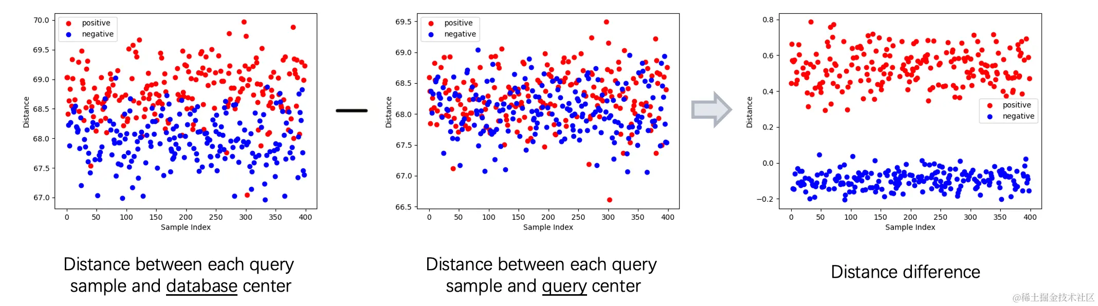 在第一个方案中,我们分析了基因数据的特点:发现当一条待查询的基因数据在数据库中存在亲属时,它更有可能与数据库样本维度的中心点有较大的距离。进一步讲,如果将基因数据与数据库中心、待查询数据集中心的距离相减,这种距离差异可以更清晰地划分有、无亲属关系的查询样本。