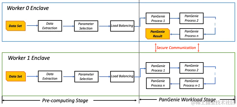 由于任务是分配到2个节点上执行,该过程中需要对统计信息(Read Variant、Load KMer Statistics)、计算结果(Genotyping)进行同步,我们对所有的通信数据进行加密以保证数据安全。