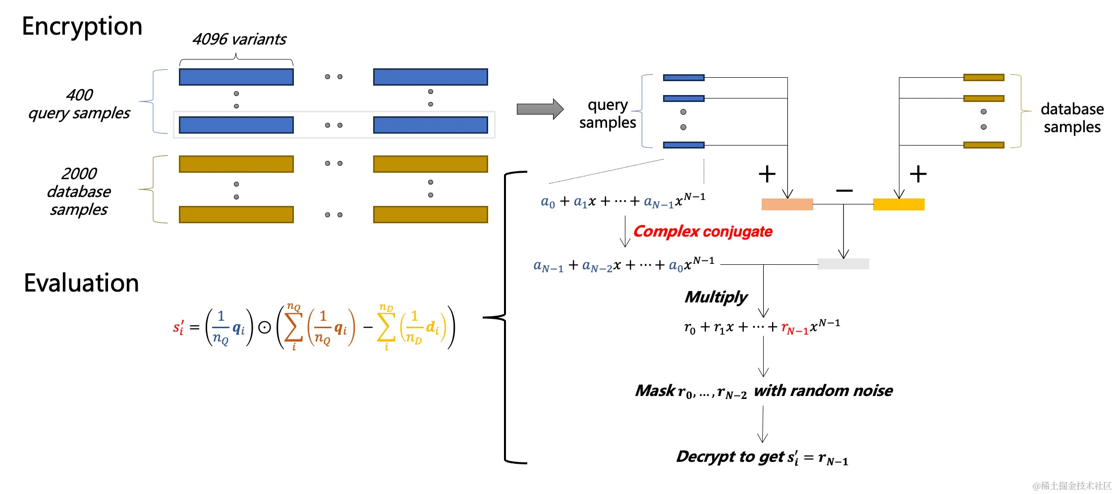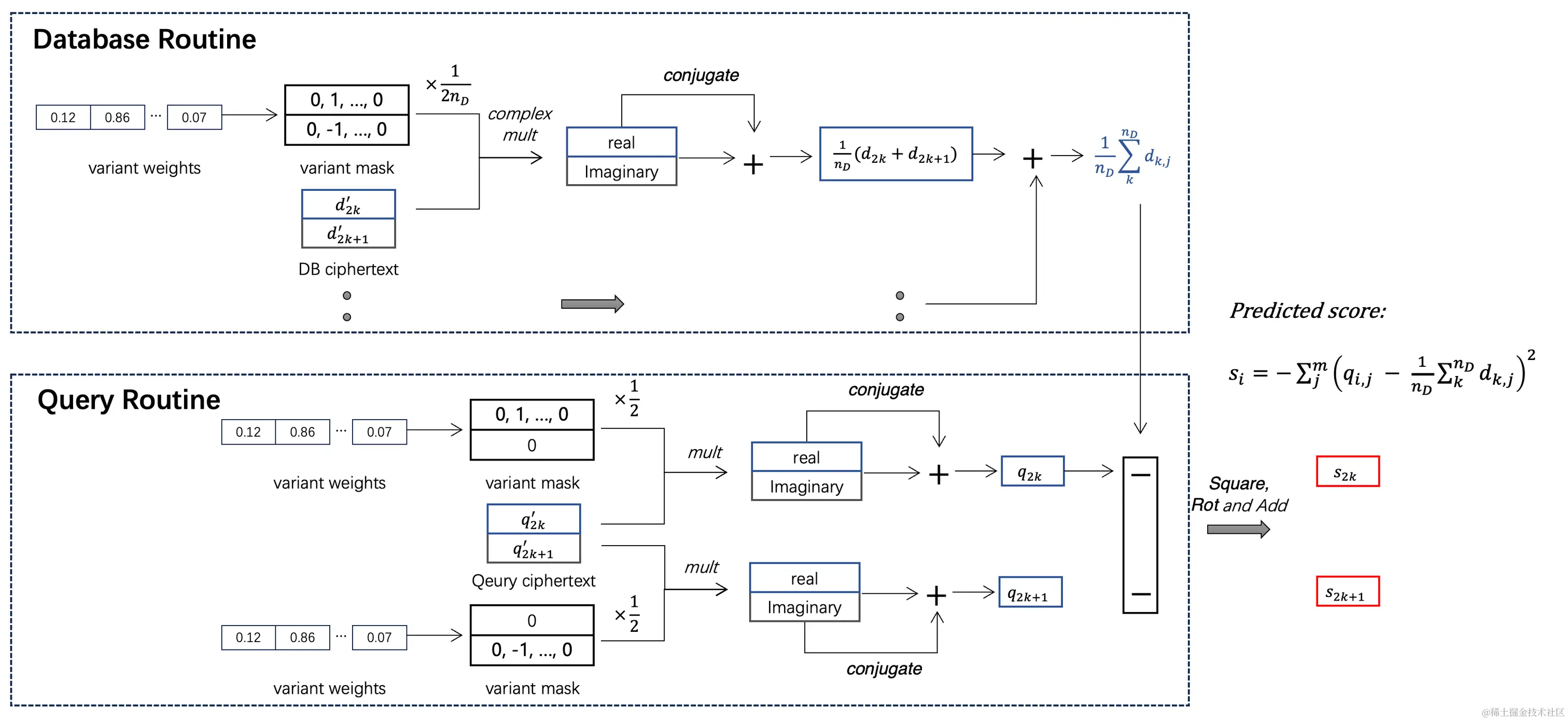 基于以上数据集特点,我们设计了使用同态加密方案来计算样本距离数据库、查询数据集中心的距离差异。首先,我们将距离差异的计算方法优化成若干加减法和一次内积运算组成的算法。在加密数据时,我们采用CKKS加密算法并通过系数编码的方式将多个基因数据加密到一条密文多项式的系数上。基于这种编码方式,可以通过一次多项式乘法计算出两组密文数据向量的内积,从而得到一条样本对应的预测得分。最后,查询机构可以解密、并根据得分大小判断出查询样本是否在数据库内存在亲属的可能性。