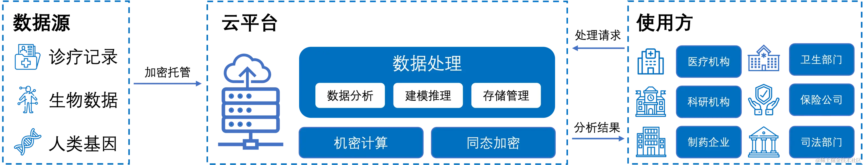 在生物信息领域,一方面对个人数据的隐私保护至关重要,另一方面医疗单位和研究机构又迫切需要打通各方数据。因此,隐私计算已逐渐成为该领域的关键技术,促进多方共同参与、合规挖掘利用数据的宝贵价值:来自不同数据源的生信数据经过加密处理后,存储在具备隐私计算能力的云平台上,进而为泛在数据使用提供所需服务。例如,隐私计算能够帮助医疗、保险机构利用个体基因数据有效地预测潜在疾病风险,从而作出综合评判。研究人员也可以通过隐私计算挖掘数据多维度价值,建立精准模型辅助诊疗、加速新药物研发等,推动生物信息领域的研究和应用创新。