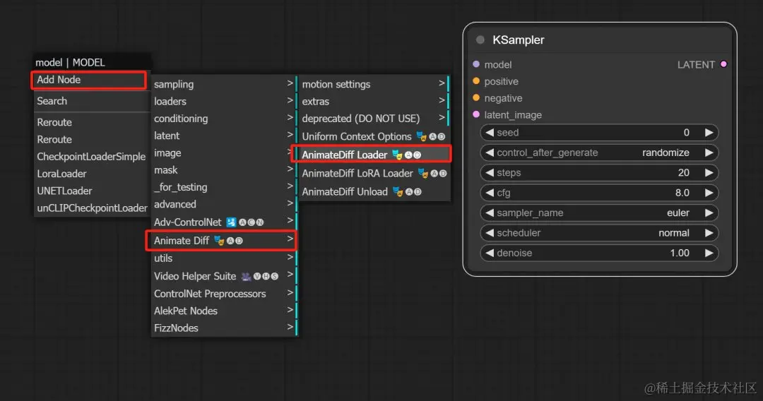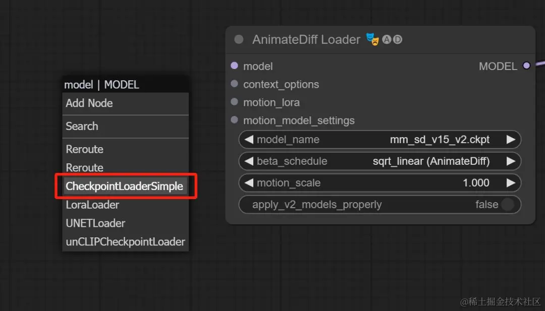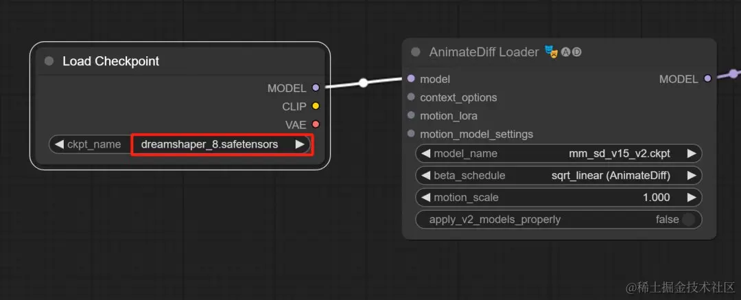 将“AnimateDiff Loader”下的模型按钮继续外拉,选择