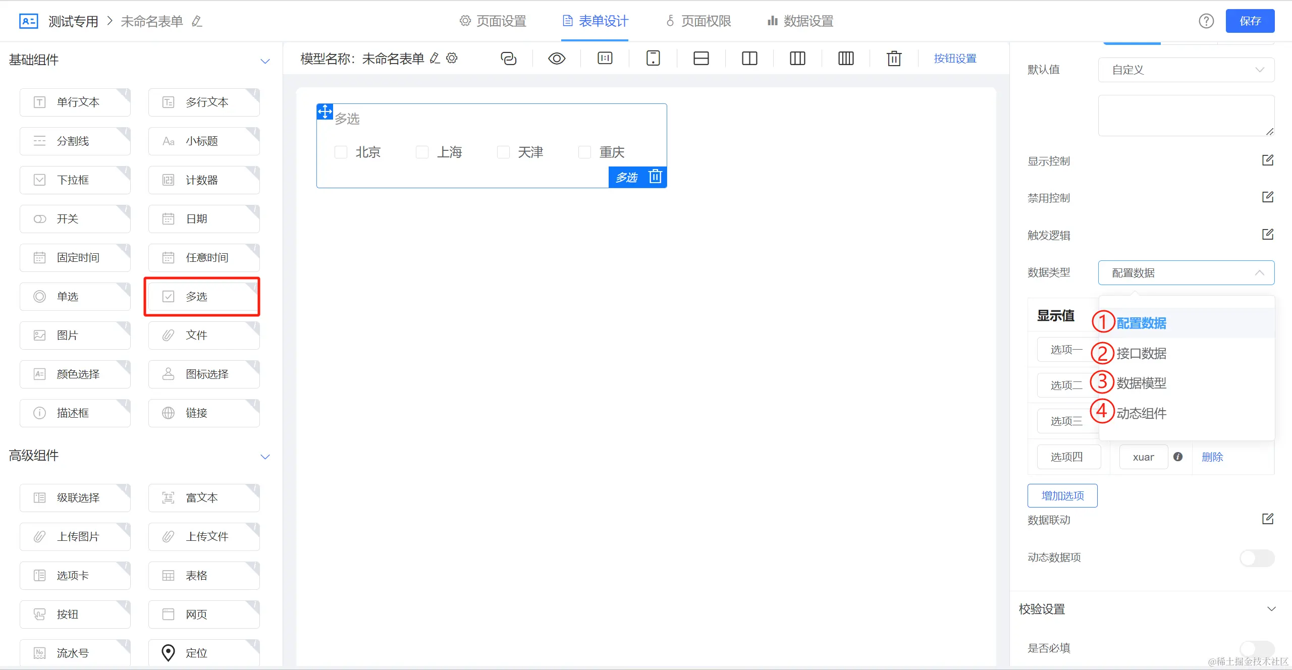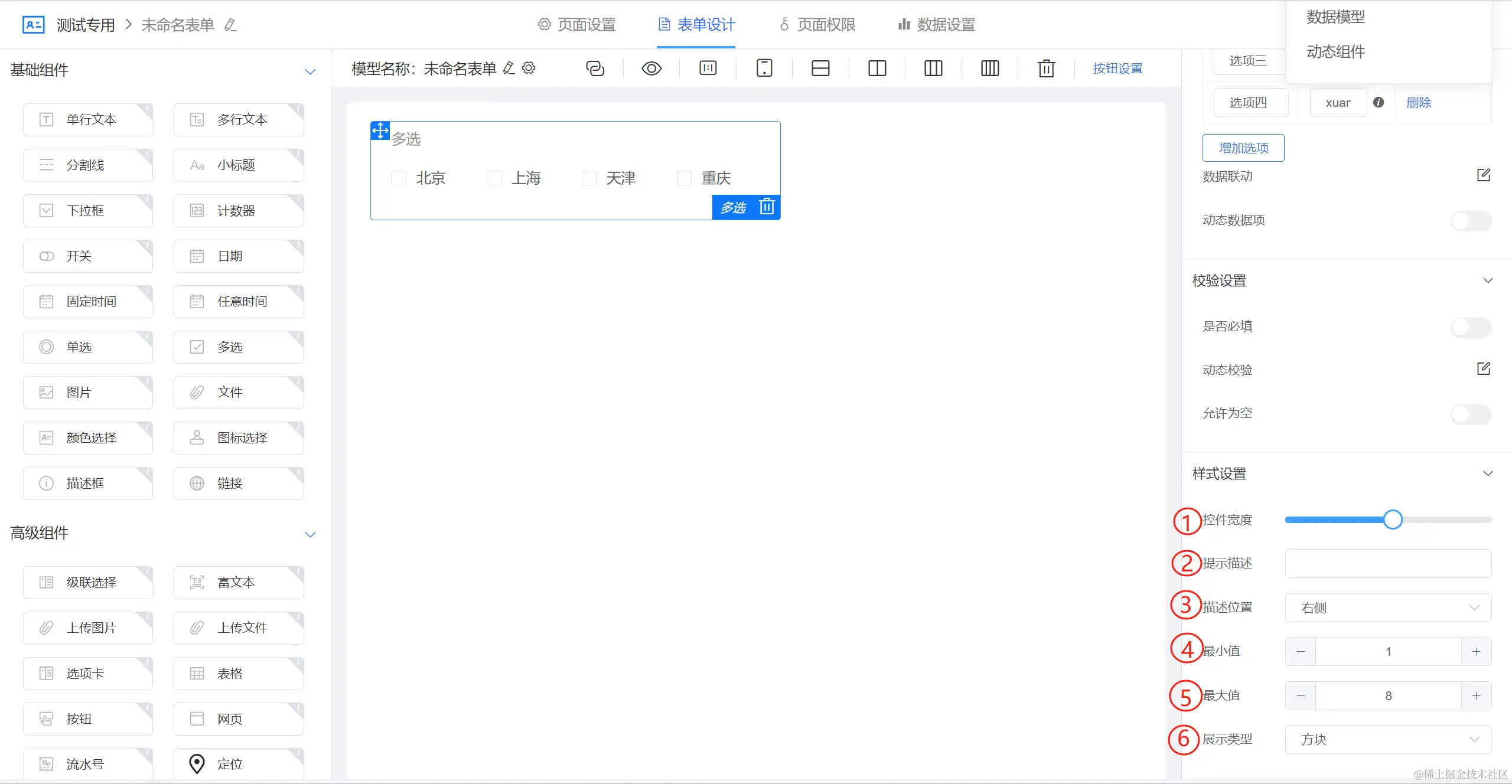 多选组件同单选配置大同小异,其中数据类型多一个动态组件,样式设置不同。
