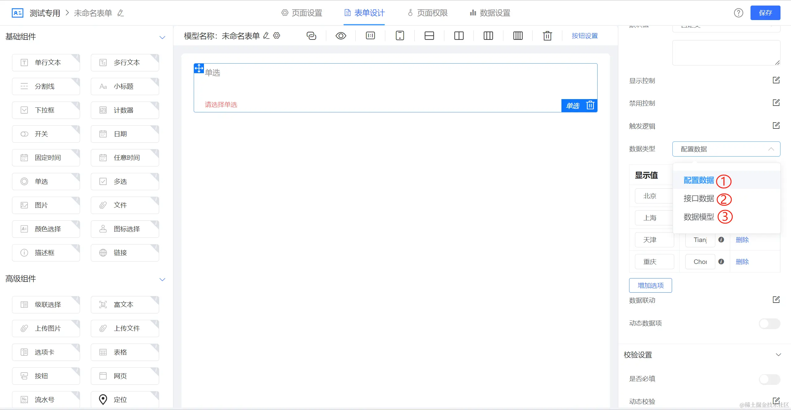 ①:配置数据,默认数据来源是配置数据,可以自定义增加选项,传递值都是字符串。