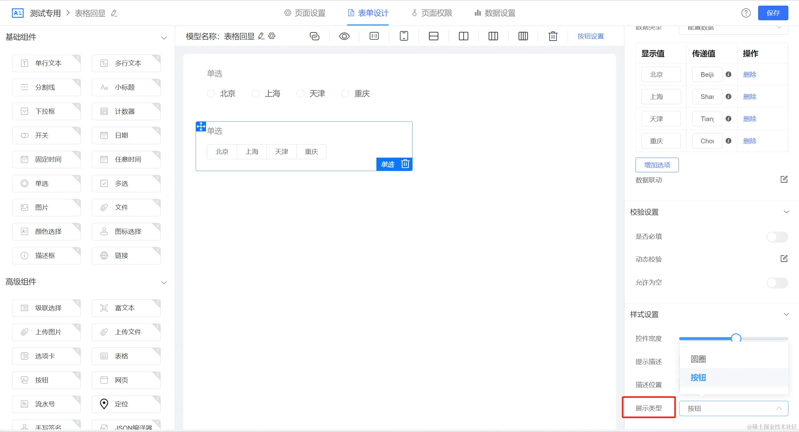③:显示值,指单选项显示的值,数据来自于选择的模型中字段。