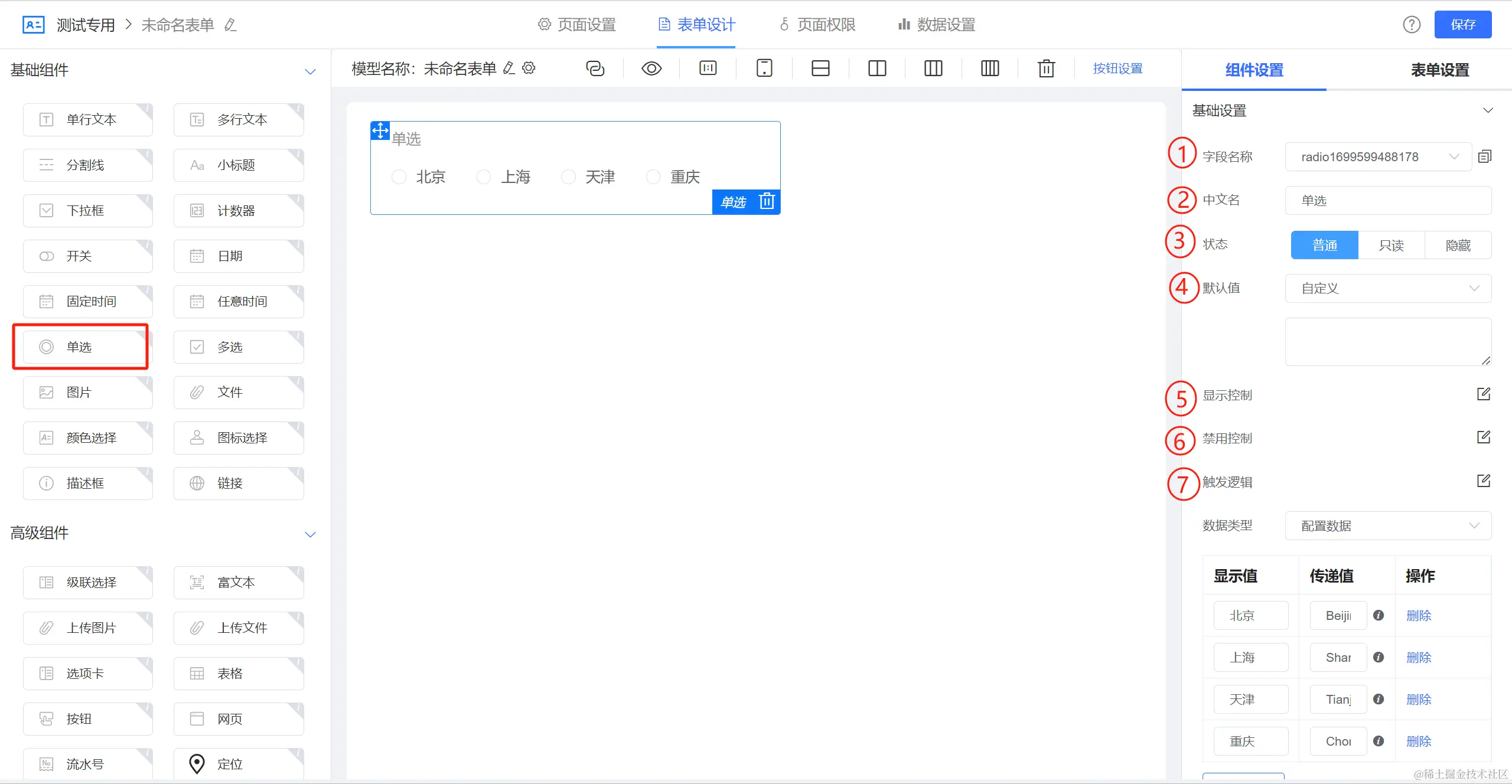 ⑥:禁用控制,通过其他组件结果的设置内容判断条件,当条件为真时单选禁止操作。