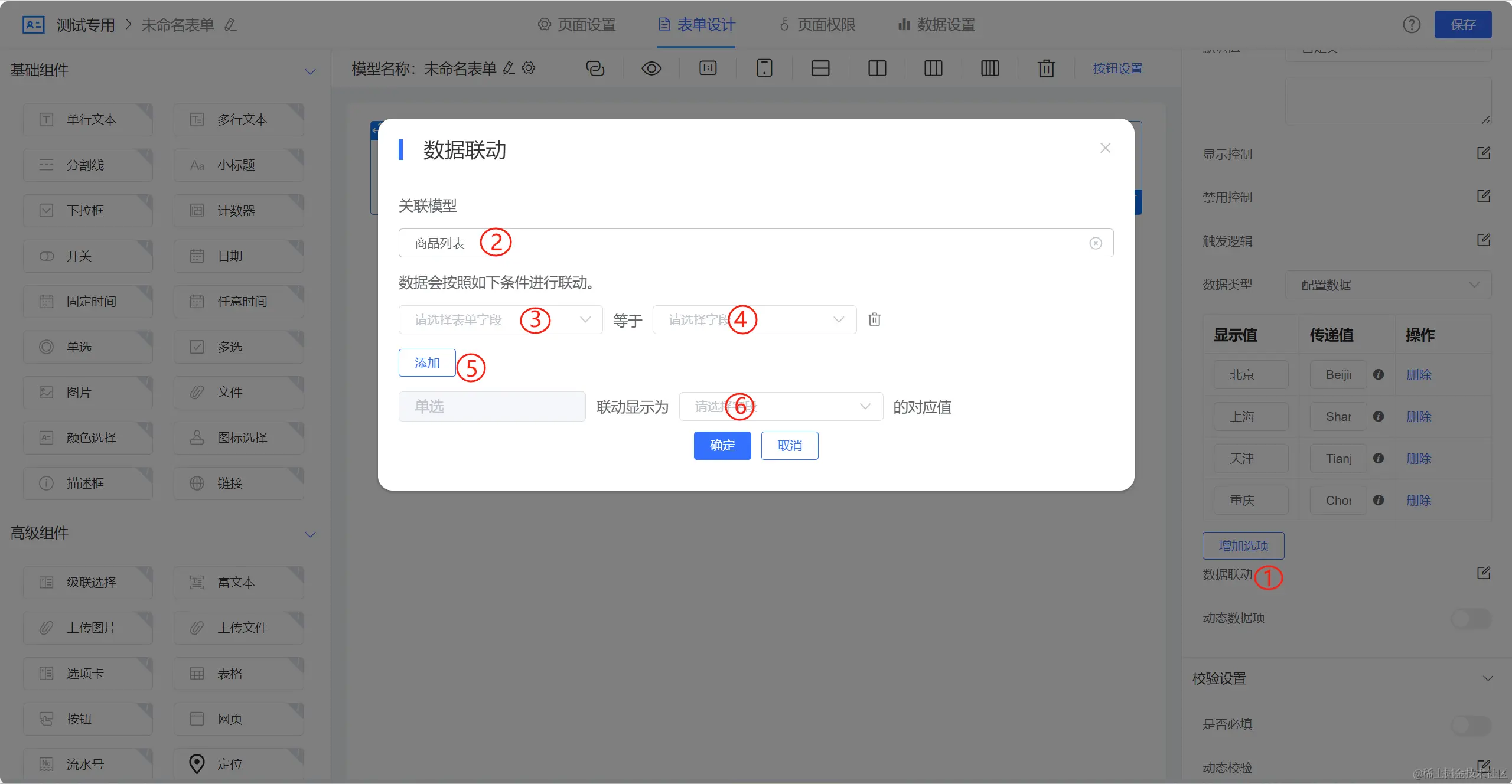 ③:模型数据,选项数据来源于其它模型,设置关联的模型,显示值、传递值等。