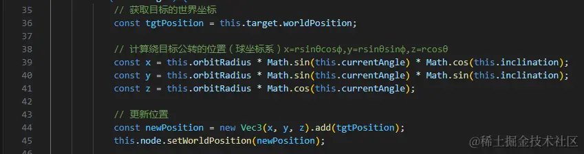 获取目标的世界坐标,通过球坐标公式计算出并更新设置实际坐标。